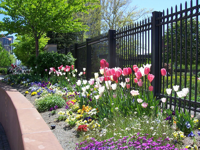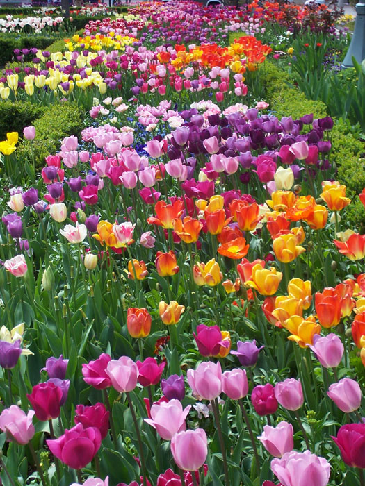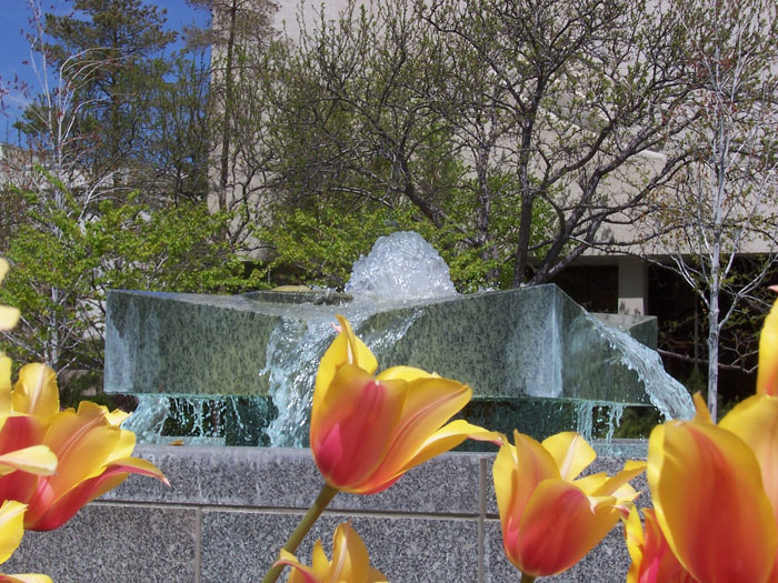The fountains add to the beauty of the garden flowers, mostly tulips