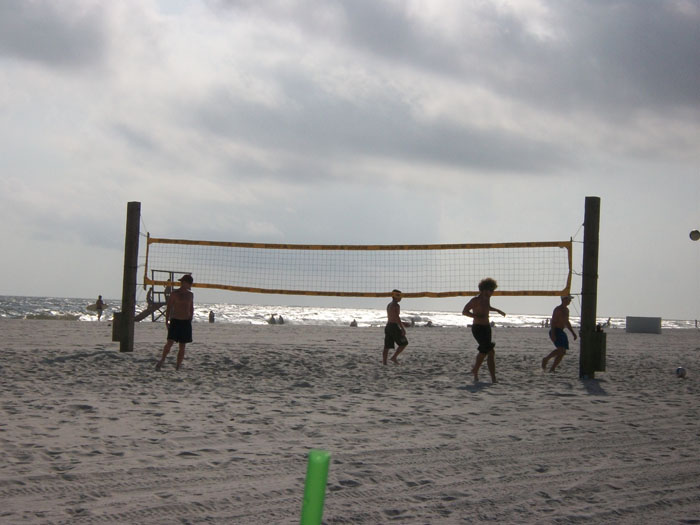 Young people on the beach played volleyball.