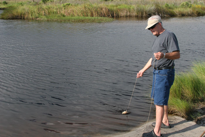 we drove around the lake we spotted an older couple fishing for crabs.