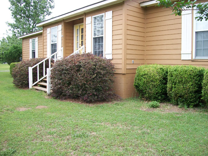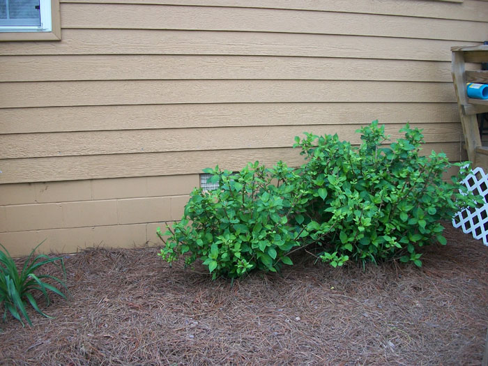 steps. On the other end of the house are tall Althea shrubs.