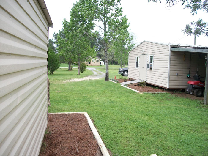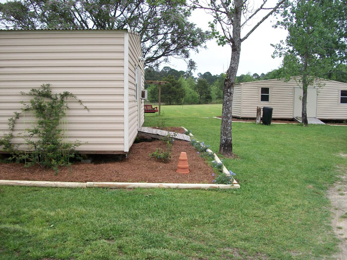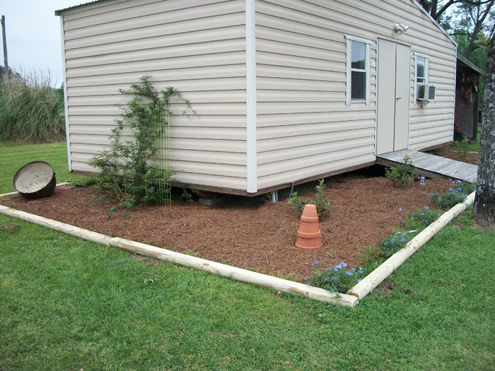 She planted flower beds with a border around both storage buildings. Here below