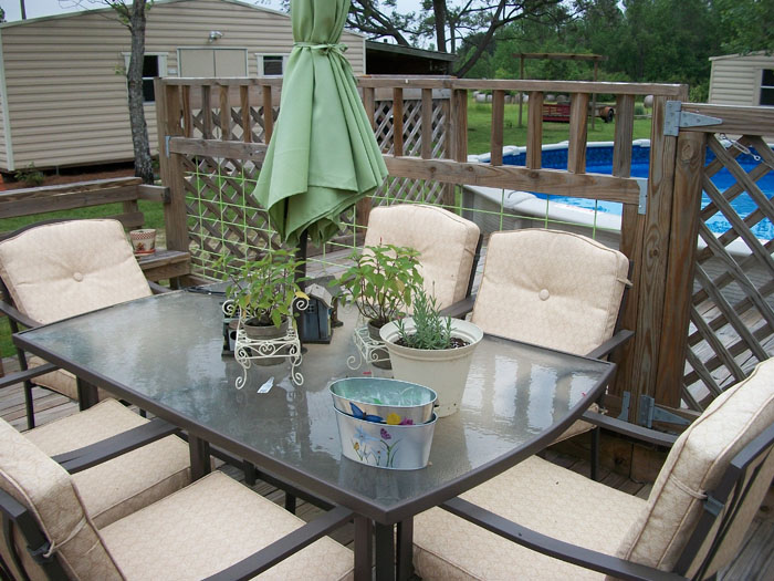 Here on the patio table are Pinapple Sage and Lavender which Linda says chases off the mosquitoes.