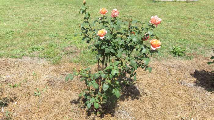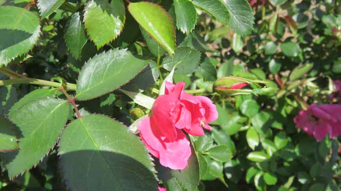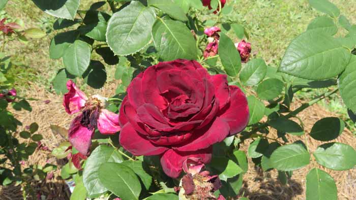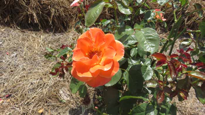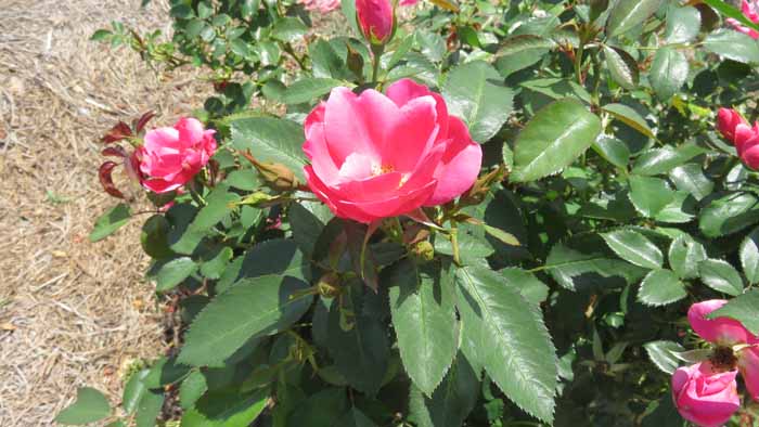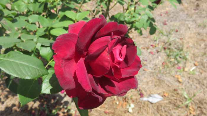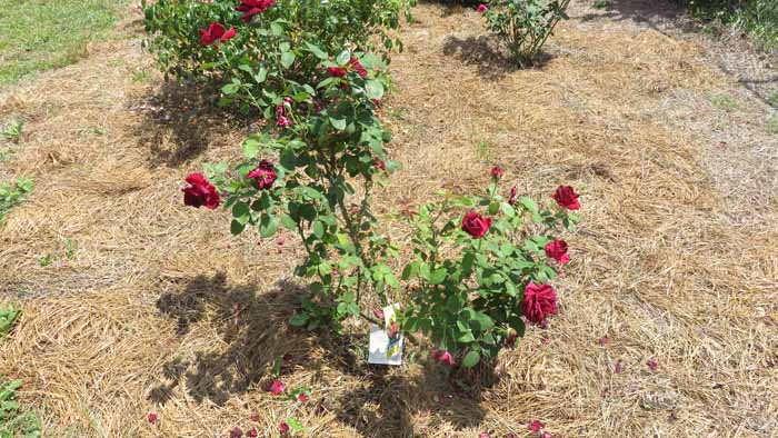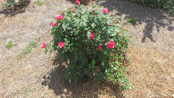 This red rose grows smaller flowers but lots of 'em once it fills out with blooms.