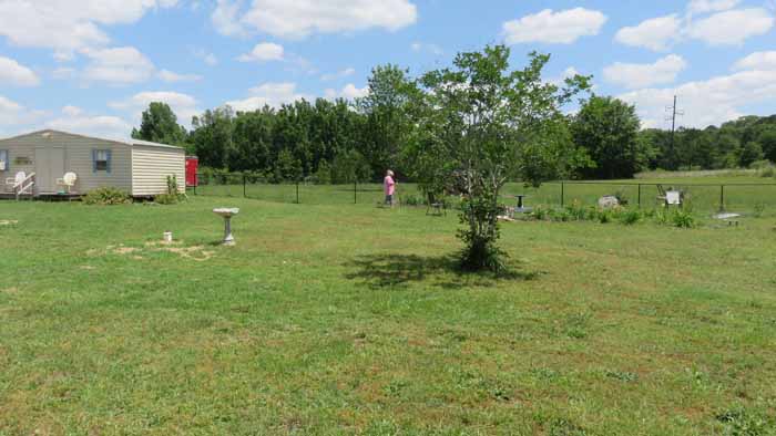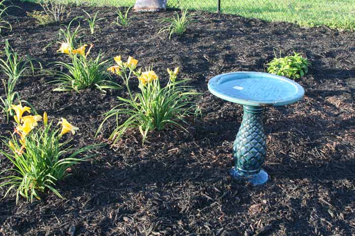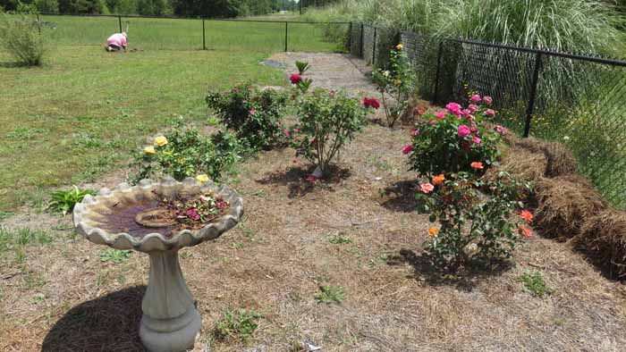 Here's one of Linda's bird baths in the foreground with pine straw by the fence waiting to