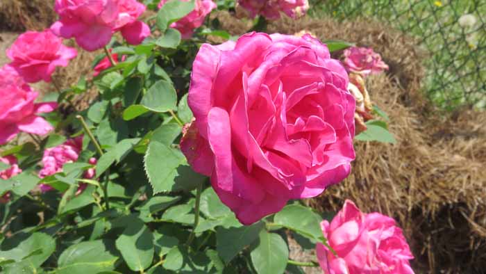 in the distance. The row of pampas grass borders the roses on the opposite side of the fence.