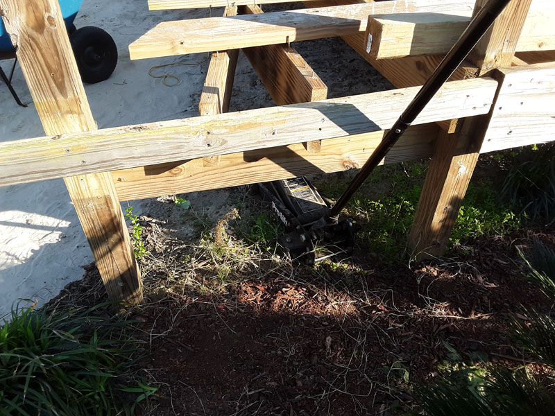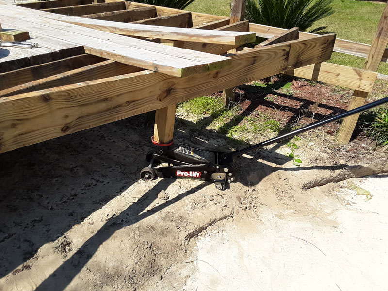 Here's a photo of the car jack in place. Some boards popped right up. Others only loosened and I still